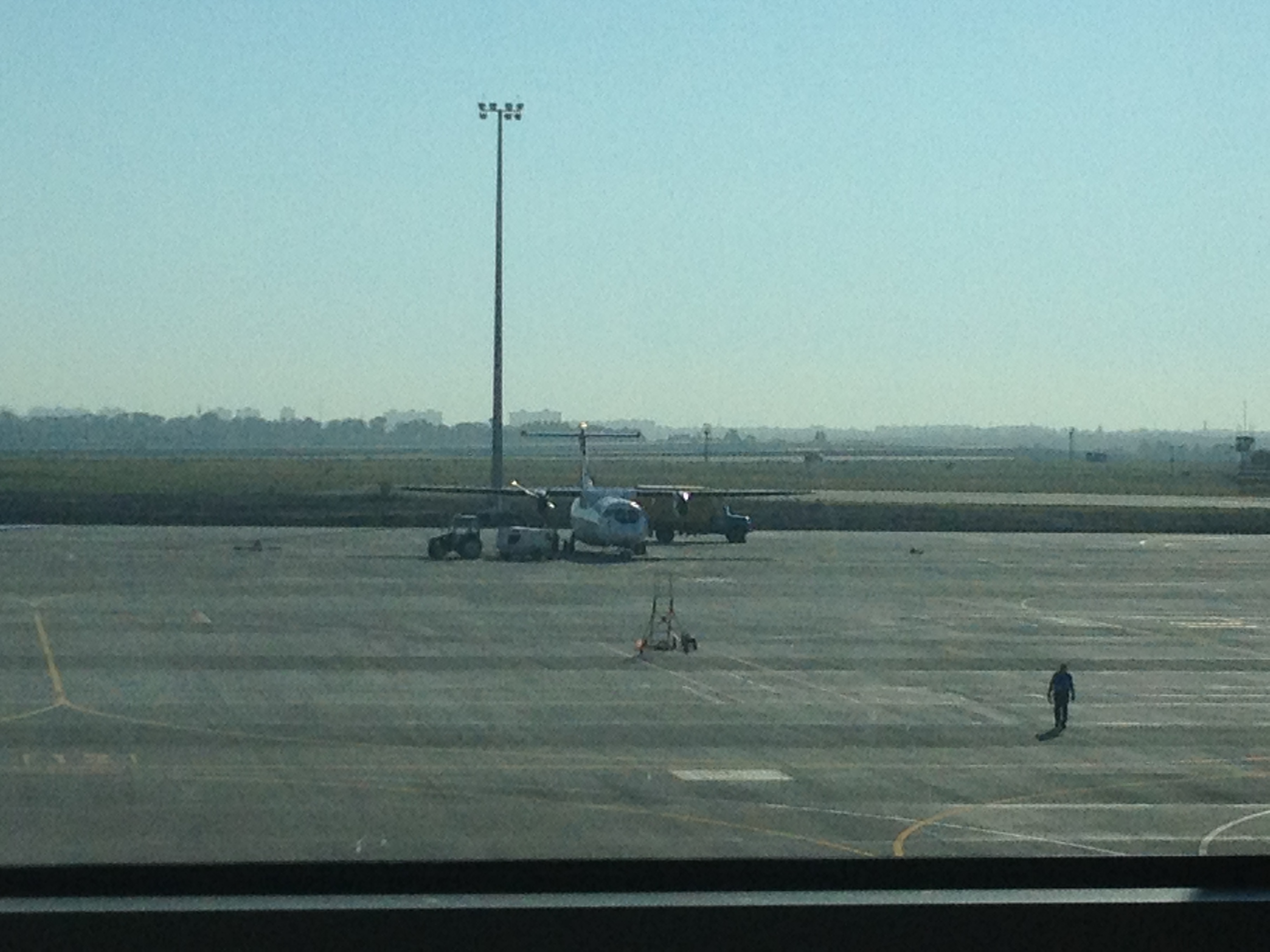 Утренний рейс на Жуляны является так сказать "заключительным" в утренней мини-волне вылетов, поэтому регистрацию и контроль на авиабезопасность можно в среднем пройти за 10-15 мин. Затем есть время выпить чашечку кофе в зале вылетов и полюбоваться на ATR-42, который готовится к вылету.