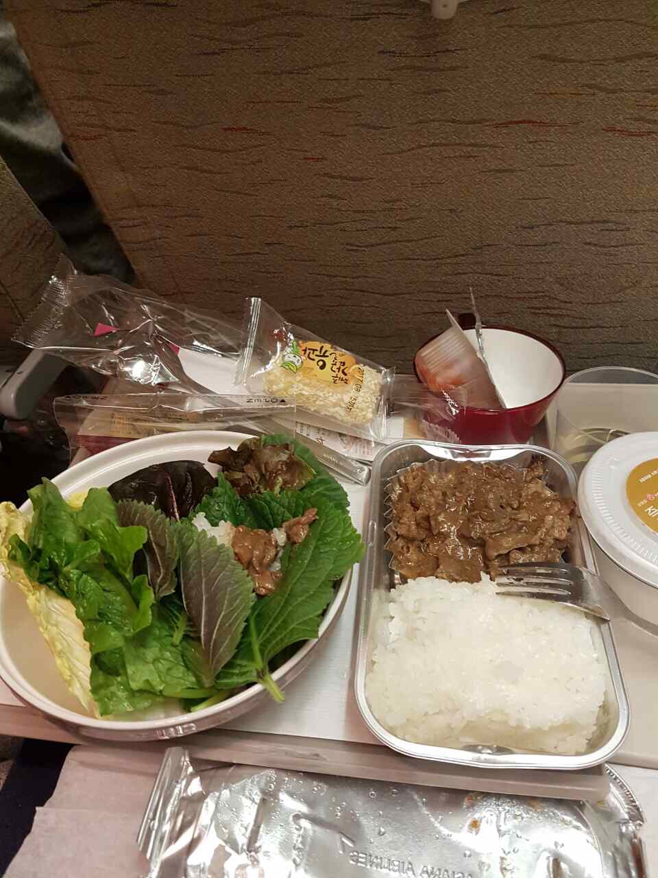спочатку рознесли снеки і водичку: потім запропонували на вибір курочку з картопляним пирогом і тушкованими овочами: або вегетаріанську лазанью: столові прибори - пластикові в пакетику.
