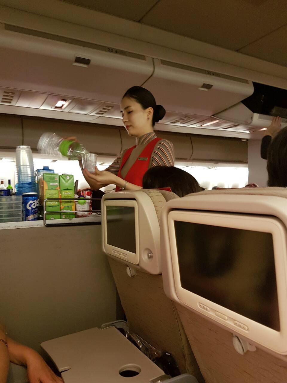 На зворотньому шляху замість печива-літачків була вівсяна печенька з журавлиною (а дружині попалась з білим шоколадом). Замість лазаньї були макарони, а курочка була з картоплею пюре і картоплею шматочками. Один раз давали "шайбу" з джерельною водою і один раз просто наливали воду з пляшки а-ля МАУ.