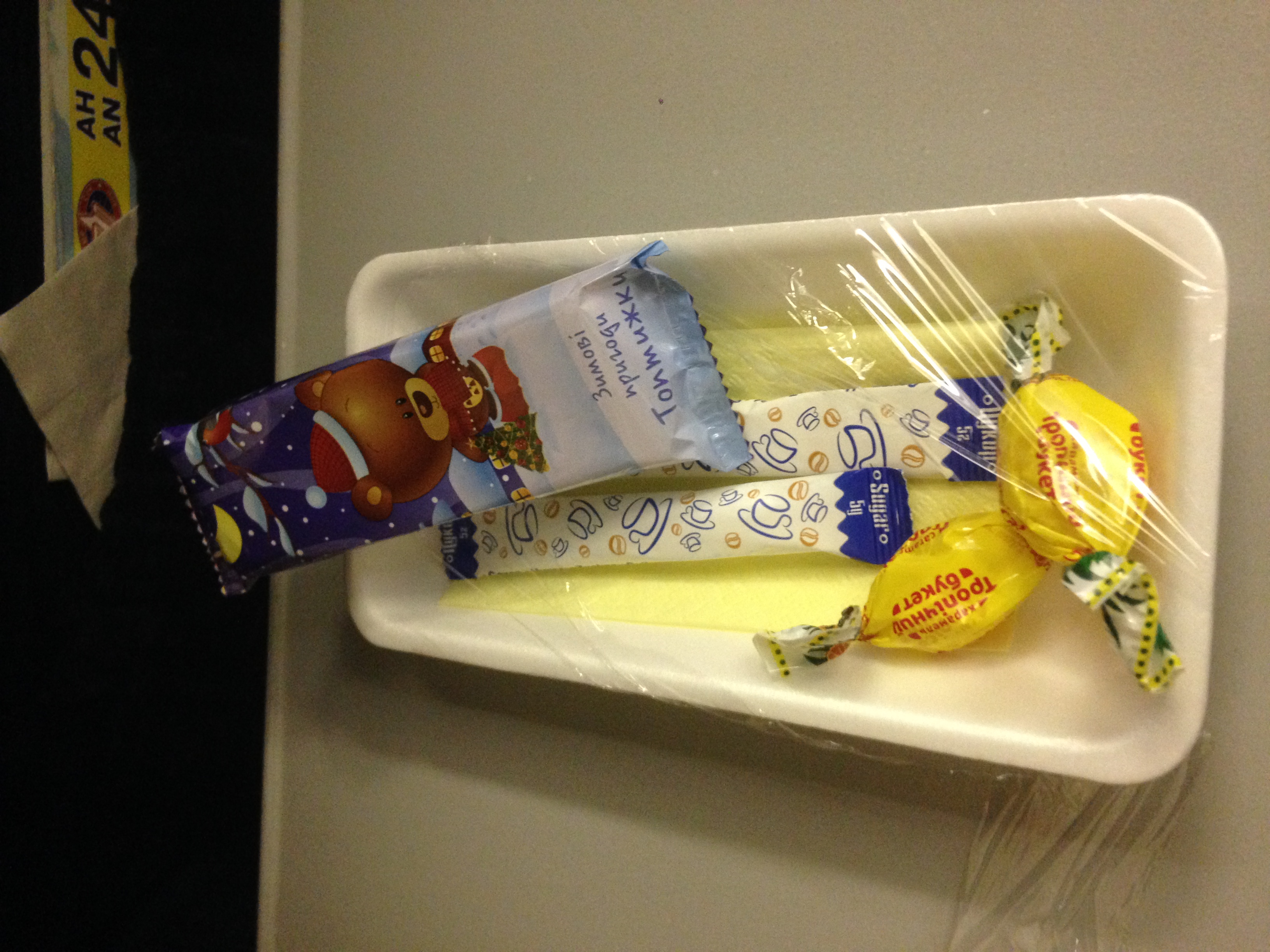 На зворотньому шляху замість печива-літачків була вівсяна печенька з журавлиною (а дружині попалась з білим шоколадом). Замість лазаньї були макарони, а курочка була з картоплею пюре і картоплею шматочками. Один раз давали "шайбу" з джерельною водою і один раз просто наливали воду з пляшки а-ля МАУ.