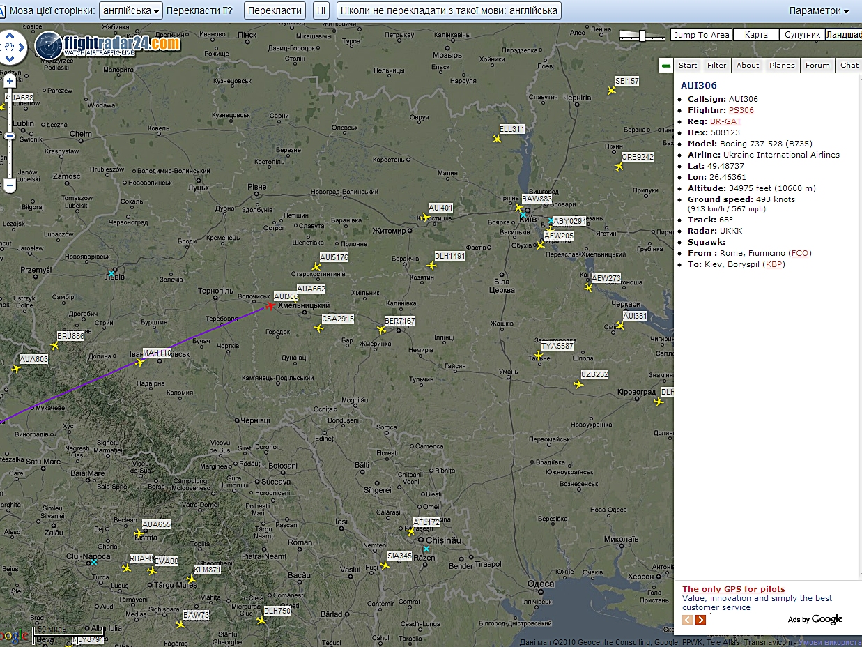 юху! якщо вірити цій системі, то над моїм Дубно проходить Malaysia Airlines Boeing 747-4H6 # From : Kuala Lumpur, Kuala Lumpur (KUL)