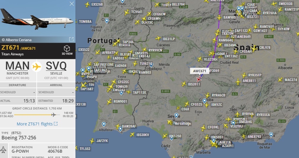 Манчестер Юнайтед на подлете к Севилье. Завтра игра лиги чемпионов. В этом сезоне лч команда всегда на 757 от Titan Airways.
