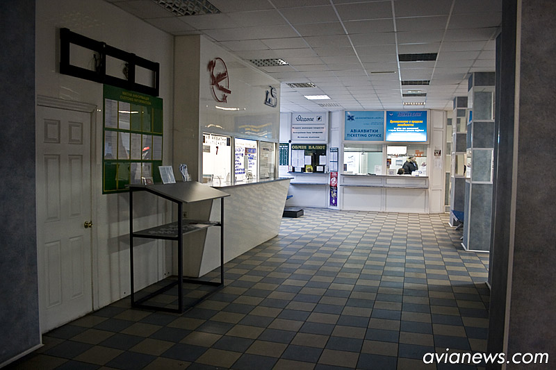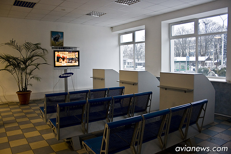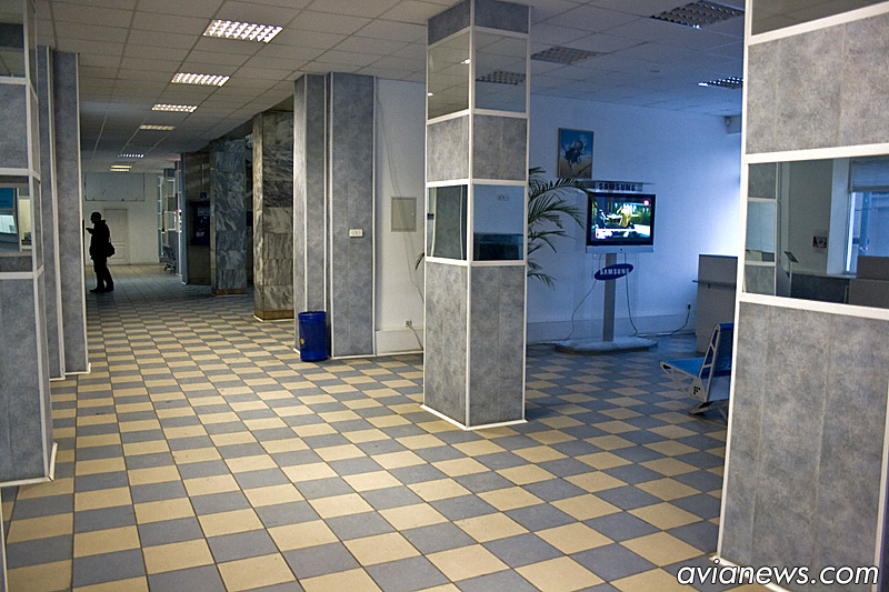Заходим в терминал. В левой крыле зал регистрации с 4 тумбочками и зал ожидания с 4 тумбочками. Тумбочки это "стойки регистрации