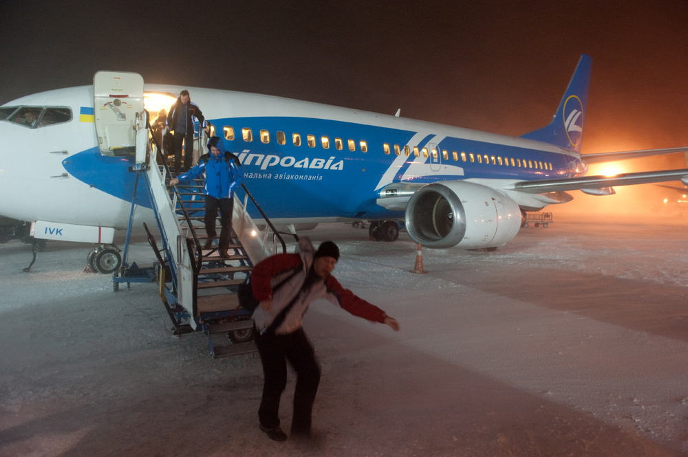 КВС Александр Дендера представился, рассказал о погоде в Киеве. Весь полет проходил достаточно низко - на эшелоне 290. Посадка на полосу 36R вышла очень мягкой, не смотря на очень сильный ветер (порывы до 20 м/с). Увидев воочию, что там твориться, я понял, что нам еще крупно повезло. Потом друзья рассказывали, что много самолетов ушло на запасные, многие долго кружили в зоне ожидания. Нам дали стоянку S11, однако по прибытию на предполагаемое место, КВС стоянку никак не мог увидеть, ибо весь перрон был засыпан толстым слоем снега :alen: :flag: Кстати, Александр оказался очень приятным человеком, что подтверждают фотографии 8-)