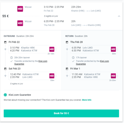 - Не всегда есть бесплатные предложения альтернативных перелетов "по гарантии", могут быть и только платные вариванты. Т.е. если стыковка сорвалась, Киви может сказать "есть варианты только с доплатой с вашей стороны", размер которой, как правило растет со временем, которого Киви для ответов обычно требуется много.
