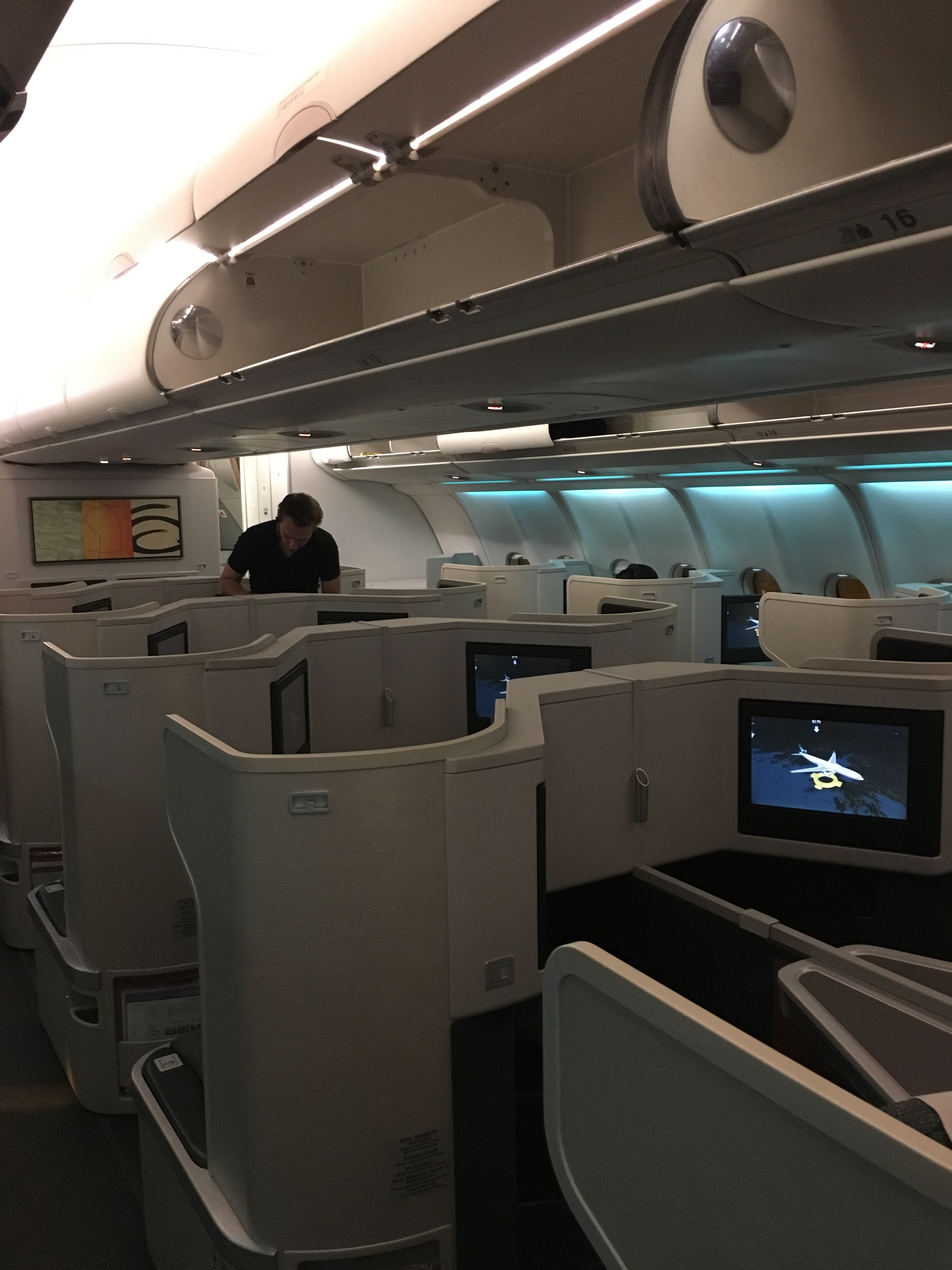 Тем временем поменялся гейт вылета и когдая пришел на него, я понял, что это было неспроста. Вместо Airbus A350-900, меня ждал А330-300, с регистрационным номером B-LBA, возраст 5 лет. Ну, чего расстраиваться? Бизнес-класс в них почти такой же. Хоть в А350 кресла и посовременнее. Но концепция одинаковая.