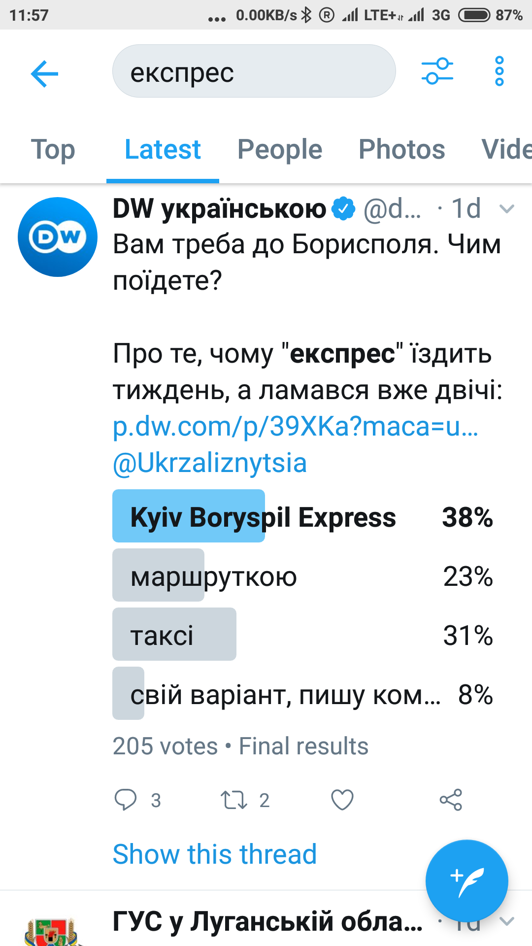 Опитування у твіттері DW - яким видом транспорту плануєте добиратися до аеропорту Бориспіль, проголосувало 205 людей