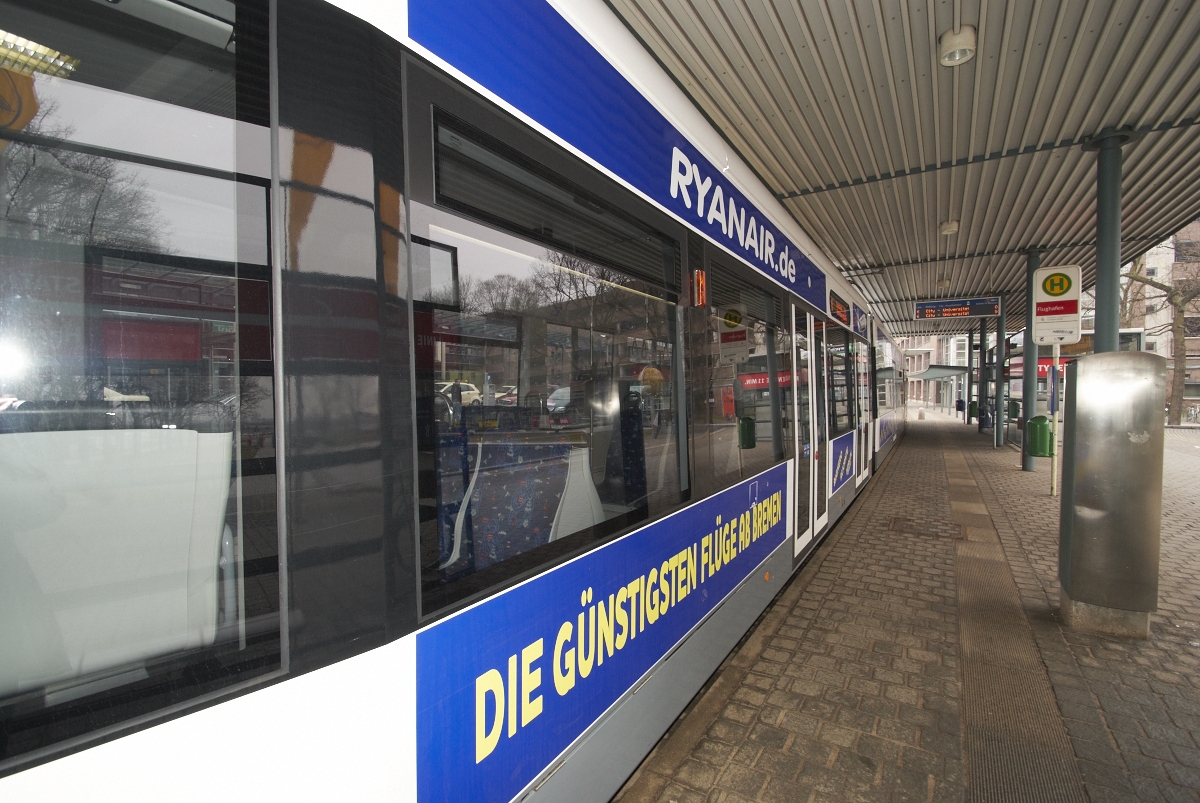 Фасад терминала со стоянкой такси: От терминала так же курсируют шаттлы в Гамбург, один такой виден на заднем плане: В центр Бремена можно попасть просто за 10-15 на трамвае, останаовка которых находится в паре сотен метров от терминала E, прямо у входа в основной терминал аэропорта. Как и Киевский аэропорт Жуляны, этот аэропорт расположен в черте города. Трамваи на линии ведущей в аэропорт обклеены рекламой Ryanair и ездят в дневное время не реже раза в 10 минут: Кроме показаного выше входа в терминал, в него еще можно поспасть и из основного терминала по небольшой галерее: Выйдя из этой галлереи попадаем к стойкам Ryanair, номера с 20 по 24, т.к. они имеют сквозную нумерацию с остальными стойками регистрации в основном терминале: Сразу справа, за стойками сдачи багажа (так и хочется назвать их стойками регистрации, но оффлайновая регистрация у раянов является нынче уделом богатых