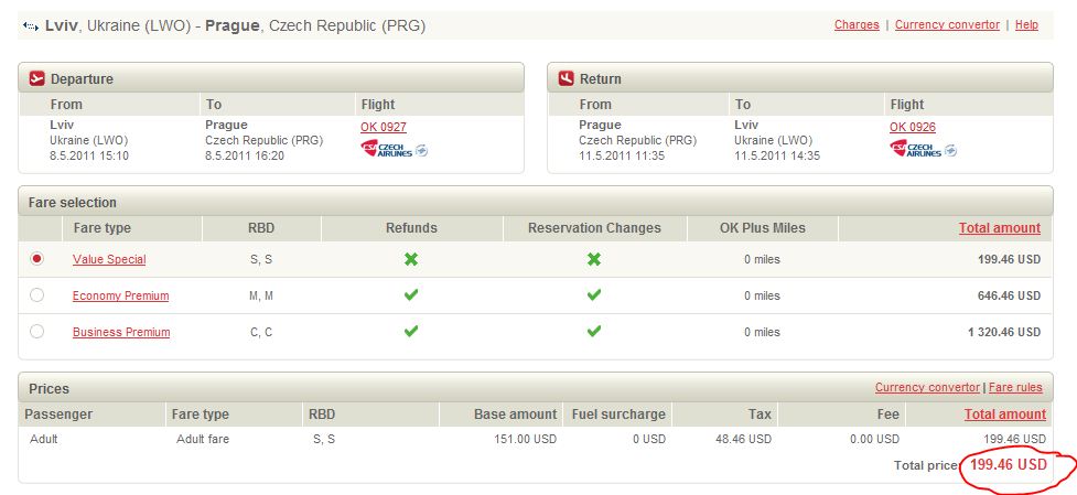 а в Одессе ежедневно (10.00-17.00 час.). В связи с запланированным началом регулярного оперирования рейсов авиакомпании «Czech Airlines» во Львов, Харьков и Донецк, в течение ближайших недель авиакомпания расширит количество мест для оплаты наличными. Новым способом оплаты наличными можно воспользоваться для оплаты любого авиабилета компании «Czech Airlines» независимо от класса резервирования или класса поездки/авиабилета, причем срок вылета должен составлять минимально семь дней от даты проведения резервирования. Авиакомпания «Czech Airlines» не взимает никакого сбора за использование этого способа оплаты. За авиабилеты, оформленные таким способом, с клиента взимается только стандартный сервисный сбор, такой же, как и при покупке авиабилета непосредственно на страницах веб-сайта компании.