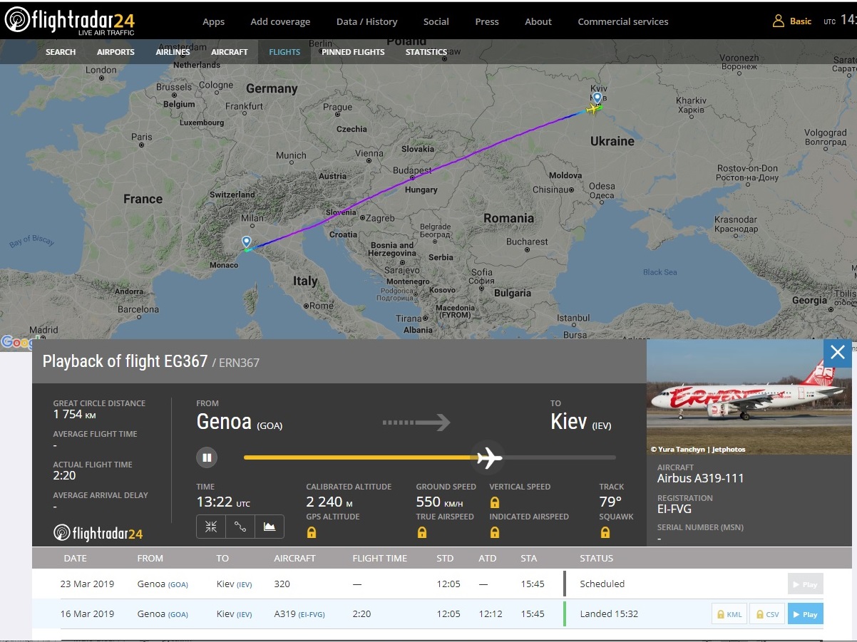 Перелет был совершен на самолете Airbus A-319 с регистрационном номер EI-FVG, возраст которого 18,4 года.
