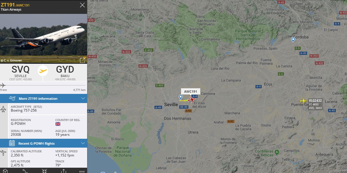 Sevilla - B757, Titan airways. В прошлом году летали с Privilege style, White.
