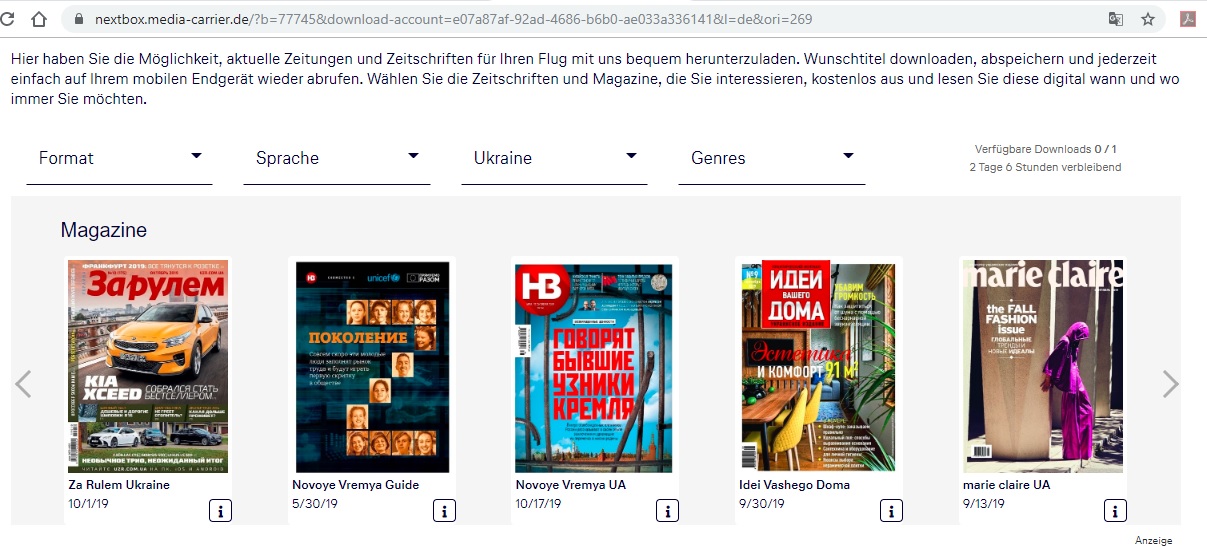 Після онлайн чекіну на рейс Люфтганзи з'являється можливість завантажити собі на комп чи інший пристрій пресу в політ. Довгий перелік країн і мов, є безкоштовні пропозиції (New York Times, наприклад), а є за гроші. Ось, що пропонується у розділі Ukraine. Жодного видання українською мовою.