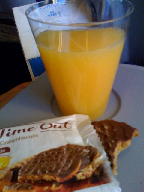 Кормили сразу после взлёта, возможно, самым вкусным несладким (сыр + томаты) горячим мультизерновым круасаном, который я когда-либо ел. Потом через какое время принесли невероятно вкусные и очень голландские штуки, которые даже не знаю, как по-русски назвать. (Голландского названия на упаковке не было). А на подлёте к Амстердаму разносили поднос-корзинку с разным печеньем, марсом, мятными конфетами и т.д. Напитки весь полёт--соки, кола, чай, кофе.