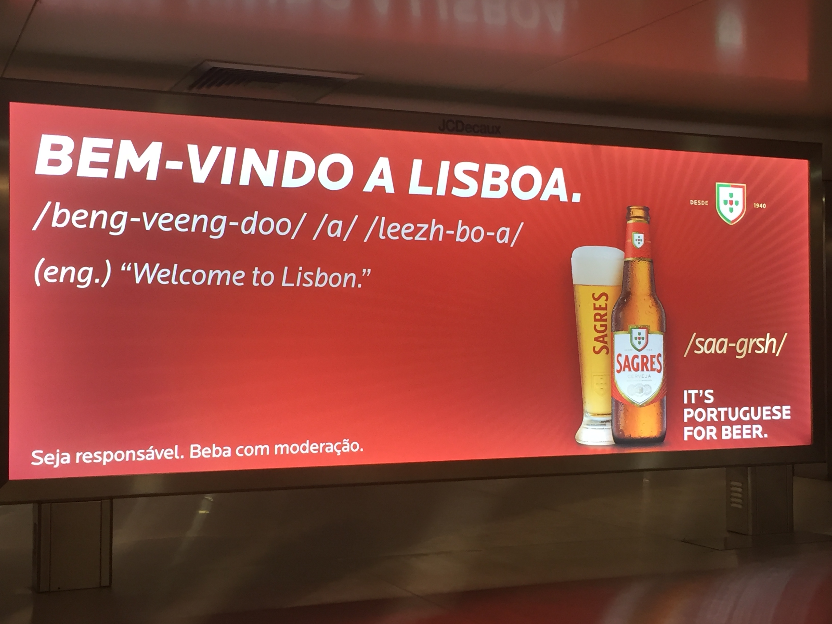 У продовження розмови про те, як пишуться пронаунсери на іноземні слова в англомовній традиції. Реклама португальського пива в лісабонському аеропорту.
