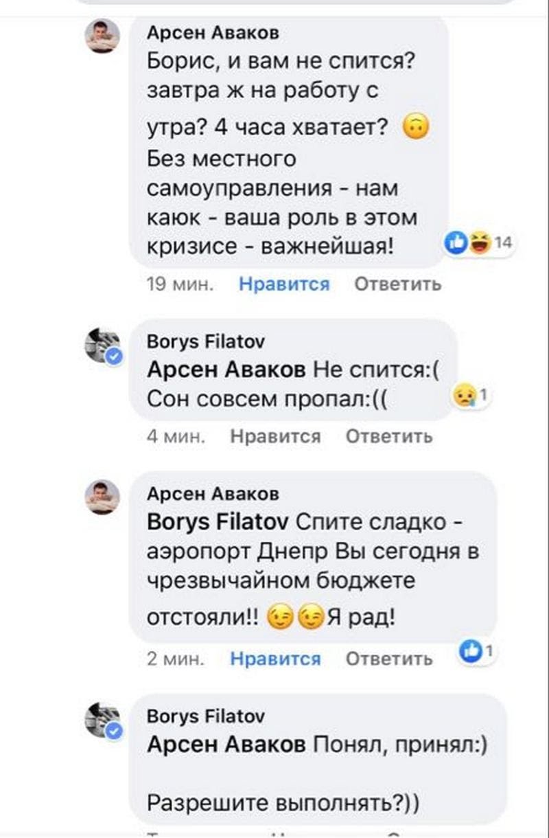 Также в комментариях к посту Аваков пообщался с городским головой Днепра Борисом Филатовым. Они обсудили роль местного самоуправления во время эпидемии. Аваков признал, что без местных властей Украине не справится.