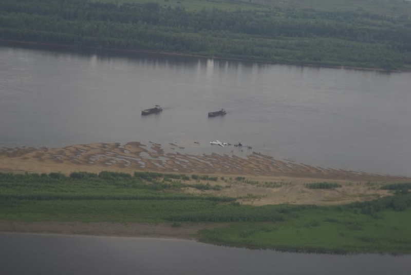 Самолет частично разрушен (фюзеляж переломлен на 3 части) находится мелководье в протоке р. Обь (песчаная коса), возгорания нет.