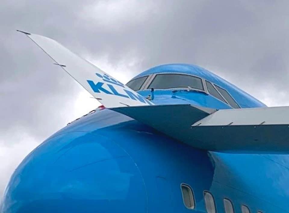 The aircraft was struck from behind the left wing at the wing root. The force of the strike was sufficient to jostle the aircraft and move it approximately one foot to the right. The left main landing gear was struck, and the inner tire was punctured and heavily damaged by the tongue of the first dolly. The left main landing gear door also incurred damage, along with the side of the fuselage where the cargo pallet came to rest, which incurred scuffs. The aircraft, shifted in position, was initially forced tightly onto the wheel chock on its right main landing gear; the chock was distorted from the pressure of the aircraft's weight.