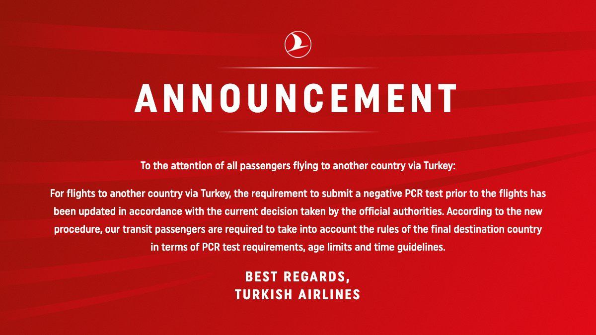 For the flights to another country via Turkey, the requirement to submit a negative PCR test prior to the flights has been updated in accordance to with the current decision taken by the official authorities. According to the new procedure, our transit passengers are required to take into account the rules of the final destination country in terms of PCR test requirements.