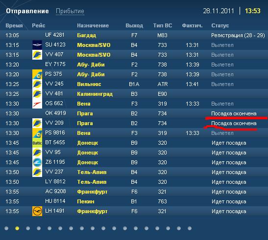 Так это же не первая страница этого табло, а четвёртая. На скриншоте, скорее всего, уже вылеты следующего дня.Андрей_киев писав:время на компе 21:38 регистрация на 15:35Стою на асфальте я в лыжи обутый, толи лыжи не едут, толи я