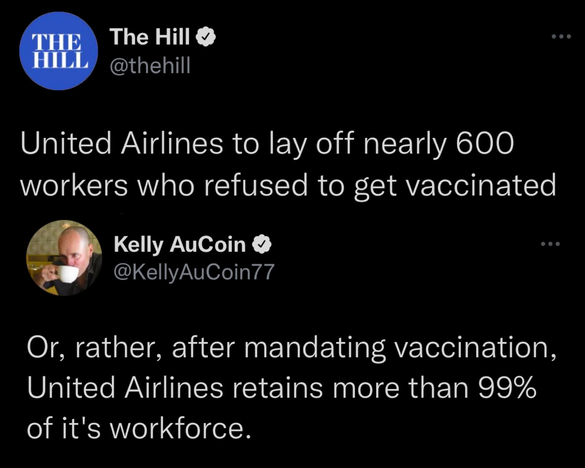 ...или сформулировав иначе: "United Airlines оставило 99% сотрудников, выполнивших распоряжение руководства об обязательной вакцинации от COVID-19"