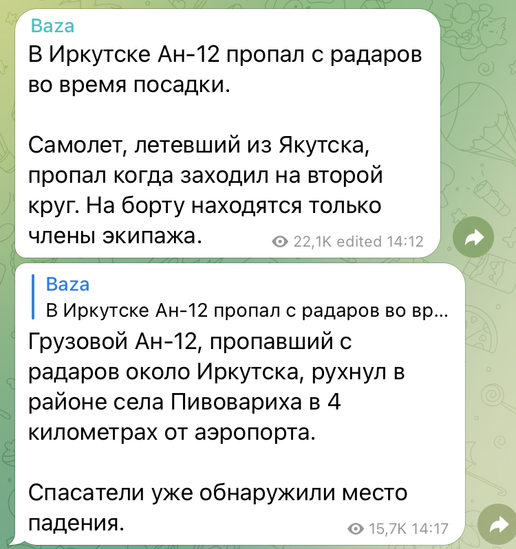 Борт, летевший из Якутска в Иркутск, пропал с радаров в 14:45 мск при заходе на посадку в районе населённого пункта Пивовариха.