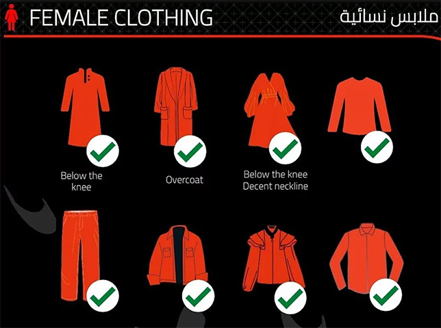 Особенно жесткие ограничения относятся к женщинам , которым рекомендуется не использовать яркий макияж, не носить прозрачную одежду или юбки выше колена, не открывать спину и не носить платья с лямками. Никакой тесной одежды.