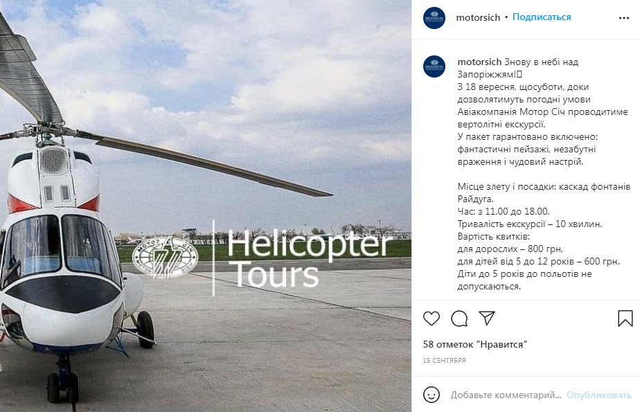 Когда-то был тут разговор по вертолетным экскурсиям от МоторСичи в Запорожье. Вот они опять анонсировали.