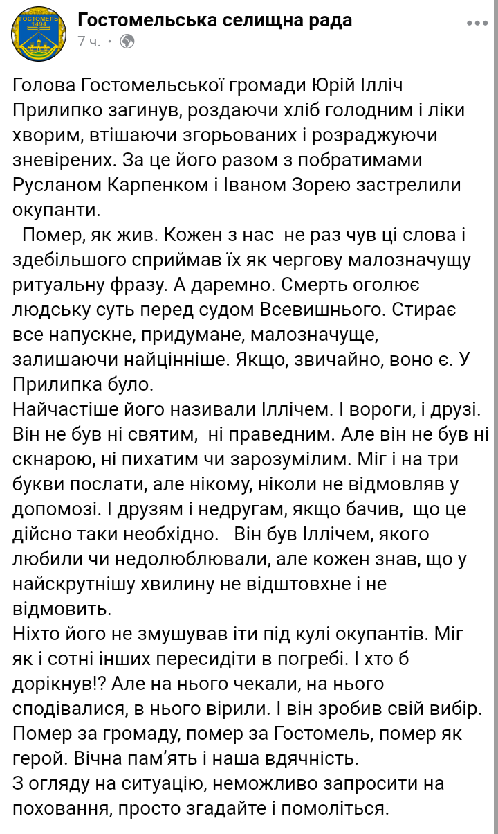 Нажаль кадировці застрелили голову Гостомельскої ОТГ, причому точно знали, кого шукати https://t.me/zloyodessit/11795