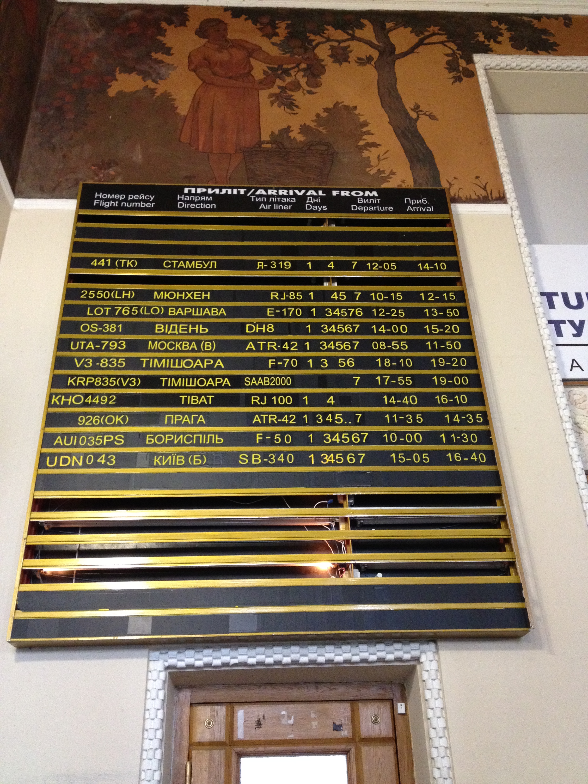 Дорога из центра города на такси заняла минут 15 по абсолютно свободным дорогам. Если честно, мы немного растерялись, войдя в главное здание аэровокзала: пространство в два раза меньшее, чем в терминале А аэропорта Борисполь, два отверстия в стенах, являвшиеся предположительно входами в зоны отправления, полное отсутствие какой-либо информации, кроме информационных табло советского образца: Ничего похожего на регистрацию пассажиров аэросвитовского рейса в Киев в терминале не происходило, хотя до вылета оставалось едва ли больше часа. Пришлось обращаться к сотрудникам, проводившим регистрацию на рейсы CarpatAir. Без них я никогда бы не догадался, что у главного терминала есть пристройка, носящая гордое название "Сектор 3 и Сектор 4", где и проходила регистрация на наш рейс. У нас был так называемый Сектор 3, представлявший из себя обычную стойку регистрации с полным отсутствием очереди. Нас попросили поставить багаж на весы, выдали посадочные на сегменты Львов - Киев и Киев - Москва, предупредив, что в Борисполе чемодан надо будет получить, а потом сдать почему-то непременно на стойке 29. После регистрации нас попросили собственноручно доставить багаж (не только ручную кладь, но и сдаваемый чемодан) на досмотр. Только после интраскопа грузчик чемодан забрал. У нас предварительно поинтересовались, что за флаконы в сдаваемом чемодане. Поверили на слово, что шампунь и бальзам. Рамка металлоискателя работала, просили все выкладывать из карманов, снимать часы, ремни. Зал ожидания представляет собо вытянутую комнату со стульями. При входе в зал слева находятся туалеты. Больше никаких изысков