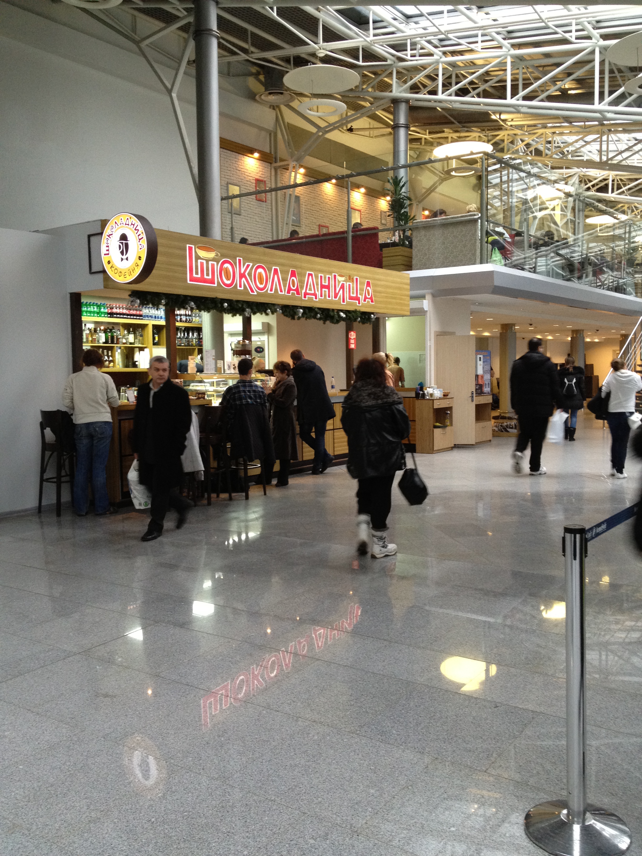 Что нового в чистой зоне Борисполя? Во-первых, мое внимание привлекла мозаика над Duty Free. Сама галерея, где раньше біла реконструкция, теперь выглядит так, как на фотках ниже. Появилась будка авиасправки, стоит елка и Дед Мороз. Там, где раньше был вечно закрытый сувенирный киоск, теперь появилась Шоколадница. Чем всегда отличался терминал Б, так это отличными видами на перрон. Посадка была через гейт В1. В самолет везли двумя автобусами. Борт - 320-ый Эйрбас Донбасаэро. Загруза почти 100 процентов. Я видел всего одно или два свободных места. Командир выходил на связь перед полетом. Говорил, что время воздушного путешествия составит 1 час 10 минут. Однако Москва долго не давала посадки и мы кружили где-то минут 20 на одной высоте. При этом ни бортпроводники, ни командир никакой информации не давали. Из еды давали сэндвичи, не такие какие я помню по Аэросвиту. Эти отличаются не в лучшую сторону. Какие-то безвкусные. По напиткам: кола, спрайт, фанта, вода, соки. Как не удивительно, но чай и кофе не предлагали.