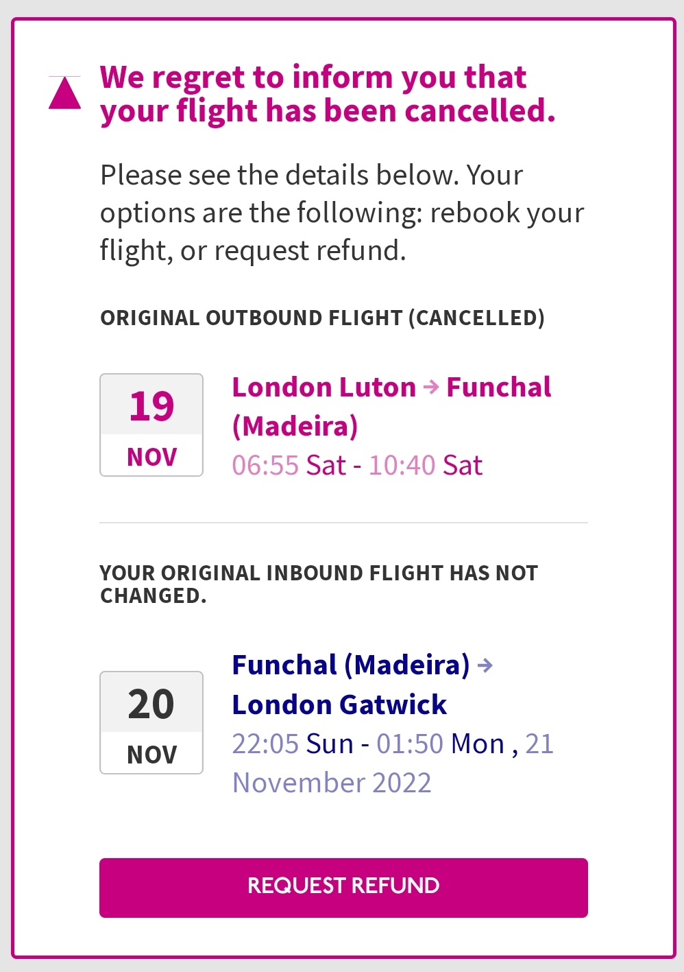 Було скасування та автоматичне перебронювання рейсу. За два дні до вильоту прийняв зміни, тепер висить ось такий напис і нічого неможливо зробити (ні онлайн реєстрацію, ні додати будь-які послуги). Змінили Лутон на Ґатвік, туди Візз ЮК, назад Візз Угорщина. Обіцяний лист більше доби як не надходить, вильоти завтра вранці. В кол-центрі розвели руками, змогли тільки додати безкоштовну реєстрацію в аеропорту, що взагалі не ок.