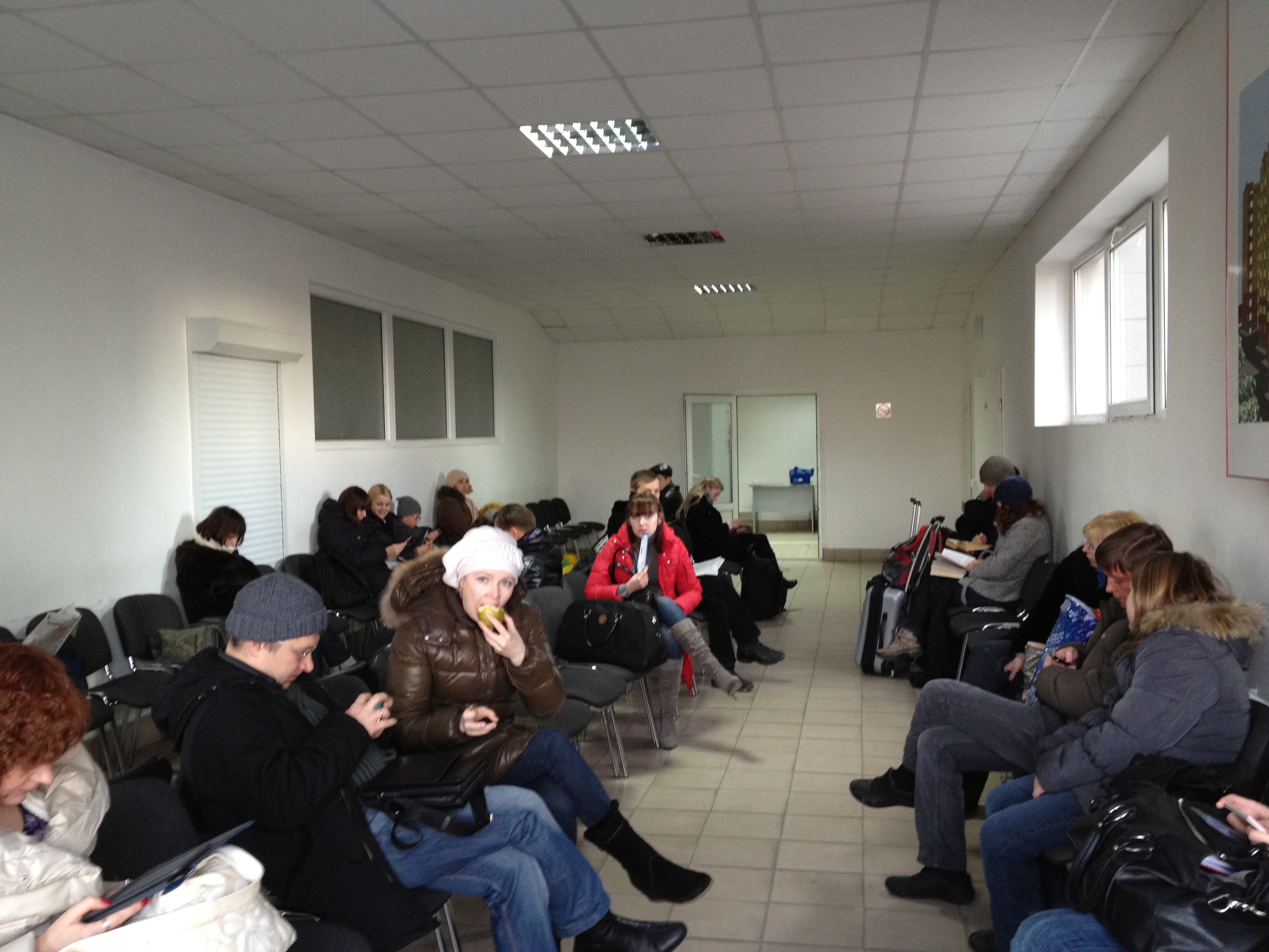 Дорога из центра города на такси заняла минут 15 по абсолютно свободным дорогам. Если честно, мы немного растерялись, войдя в главное здание аэровокзала: пространство в два раза меньшее, чем в терминале А аэропорта Борисполь, два отверстия в стенах, являвшиеся предположительно входами в зоны отправления, полное отсутствие какой-либо информации, кроме информационных табло советского образца: Ничего похожего на регистрацию пассажиров аэросвитовского рейса в Киев в терминале не происходило, хотя до вылета оставалось едва ли больше часа. Пришлось обращаться к сотрудникам, проводившим регистрацию на рейсы CarpatAir. Без них я никогда бы не догадался, что у главного терминала есть пристройка, носящая гордое название "Сектор 3 и Сектор 4", где и проходила регистрация на наш рейс. У нас был так называемый Сектор 3, представлявший из себя обычную стойку регистрации с полным отсутствием очереди. Нас попросили поставить багаж на весы, выдали посадочные на сегменты Львов - Киев и Киев - Москва, предупредив, что в Борисполе чемодан надо будет получить, а потом сдать почему-то непременно на стойке 29. После регистрации нас попросили собственноручно доставить багаж (не только ручную кладь, но и сдаваемый чемодан) на досмотр. Только после интраскопа грузчик чемодан забрал. У нас предварительно поинтересовались, что за флаконы в сдаваемом чемодане. Поверили на слово, что шампунь и бальзам. Рамка металлоискателя работала, просили все выкладывать из карманов, снимать часы, ремни. Зал ожидания представляет собо вытянутую комнату со стульями. При входе в зал слева находятся туалеты. Больше никаких изысков