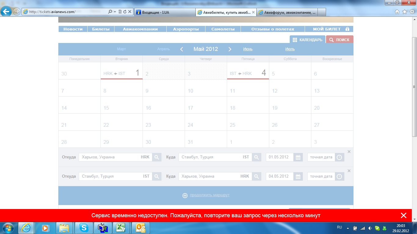 Olek, с коллегой с двух комптьютеров пытаемся посмотреть рейсы Харьков-Стамбул как на tickets.avianews.com, так и на tickets.ua - не работает...