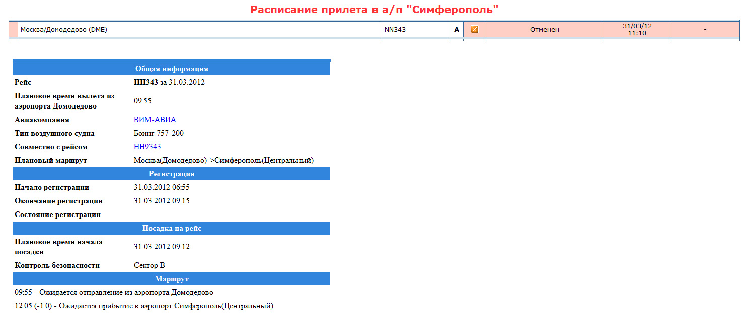 Причем, на табло Симферополя висит отмена, а на сайте Домодедово - все в порядке, еще и совмещенный рейс "Вим-Авиа" с "Вим-Авиа"