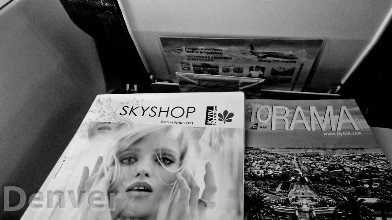 Розваги на борту - журнал Панорама та каталог Duty-free, з якого ж звісно нічого не можна купити на внутрішніх рейсах. Взлетіли добре, трохи потрясло у хмарах, на ешелоні було тихо (10000м, 800 км/год, -50 град за бортом). Капітан виходив на зв'язок тричі з параметрами польоту, стюардеси рознесли водичку/каву/чай. По дорозі обігнали хмари і Бориспіль порадував ясним небом.