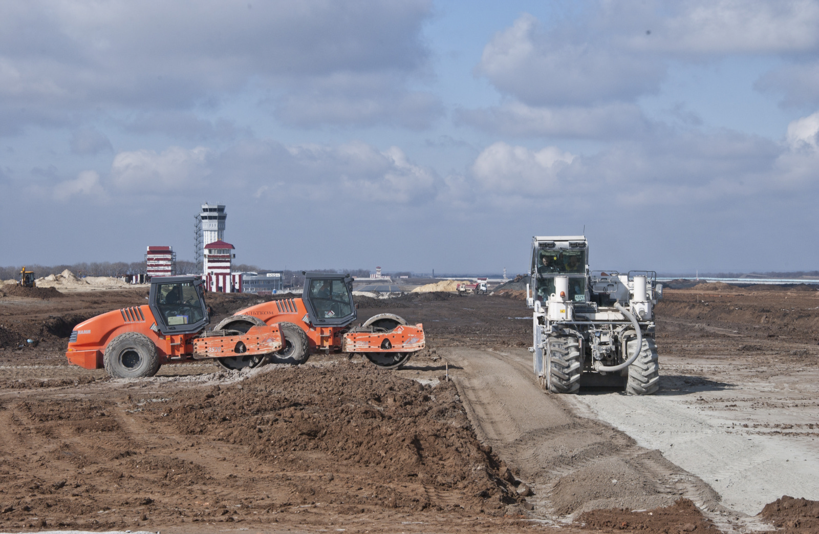 Он также отметил, что строительство обеспечивают мобильные заводы по производству бетона общей мощностью 690 метров кубических бетона в час, работают три бетоноукладчика «Wirtgen»: «SP-1600», «SP-1500» и «SP- 850». Два агрегата укладывают полосу бетона шириной 15 метров и один – 7,5 метра. На сегодня полностью готовы взлетно-посадочная полоса, перрон №2 и пять рулежных дорожек, уложено 1,2 миллиона тонн бетона, создано 550 тысяч метров квадратных покрытия. На объекте работает 400 человек, задействовано 270 единиц техники. Работы ведутся круглосуточно, в три смены.