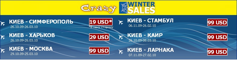 Только 20 июля 2009 года «КИЙ АВІА» предлагает уникальную возможность приобрести авиабилет на рейсы авиакомпании «Аэросвит» по суперценам*: