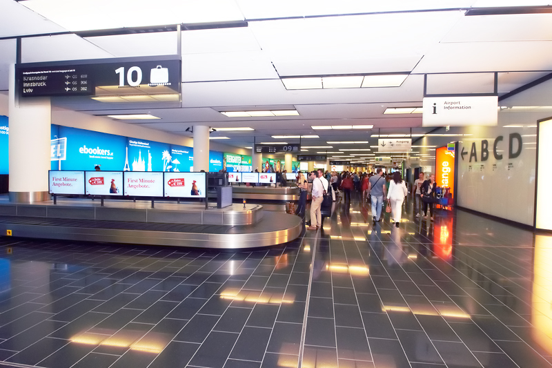 фото сделано как раз на входе в зону выдачи багажа после выхода из шегенского (синего на плане выше) автобусного гейта. Слева самая первая (точнее последняя, 10-я) багажная лента, переход на уровень 1 к галерее F у меня за спиной слева. К сожалению не сфотографировал. Обратите внимание - справа на стене указатели к гейтам A, B, С, D - вот так вот практически везде указаны направления движения - не заметить очень сложно.