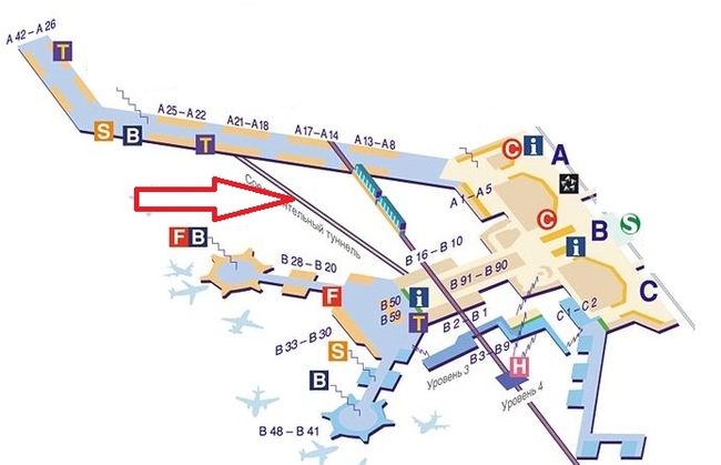 - Вот, смотрите. Наш гейт А25 находится тут. А посадка на Ваш следующий рейс - воон там, гейт В20. По коридору Вам идти не менее 10-12 минут. Но там есть подземный переход, о котором мало кто знает, он сократит Вам 5-7 минут! (и показывает на штриховую линию, идущую по диагонали между двумя терминалами прямо под лётным полем, на схеме указан красной стрелкой).