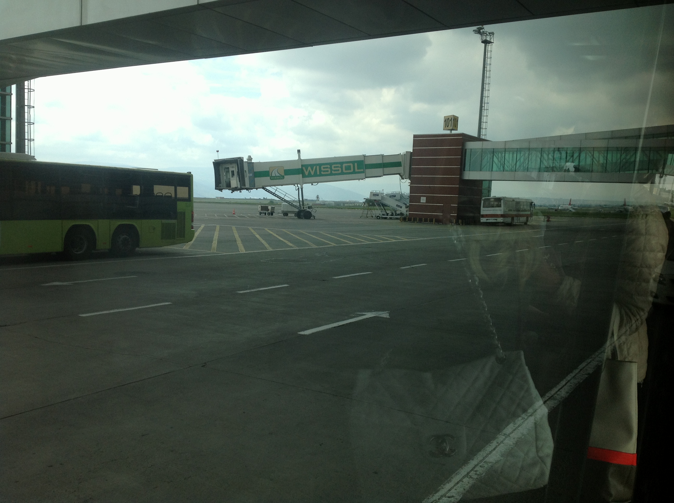 В Тбилиси у самого терминала (т.е. у телетрапов) не стояло ни одного самолёта. Все стояли слева от него метрах в 300-х. Соответственно, высадка через автобус. Вообще, подавляющее количество самолётов на лётном поле были FlyGeorgia и только 2 CRJ Airzena.