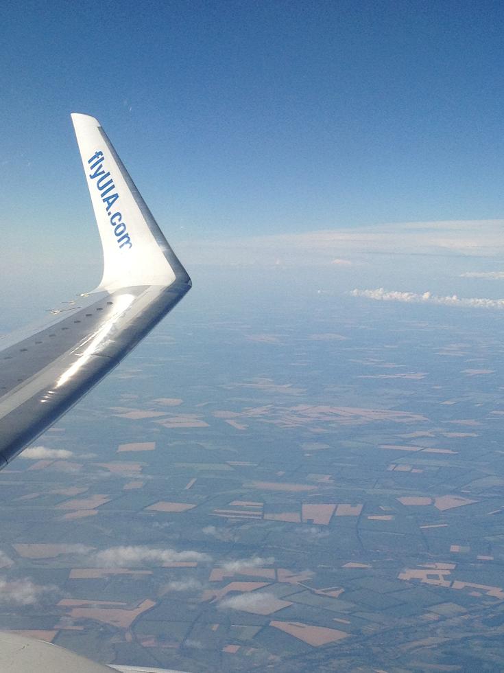 Посадка через автобусный гейт. В бизнесе загрузка 75%, в экономе 101 человек. Для 735 бота очень неплохо. Борт был старенький UR-GBE, бывший аэросвитовский ААК, но состояние бизнес-класса вполне пристойное. На коротком рейсе в 40 минут даже полноценно кормили и поили, причем на завтрак был выбор из курицы и рыбы. Я выбрал курицу. Летели на небольшой высоте, все очень мягко, плавно, стюардессы очень приветливые, погода хорошая. Подушки и пледы даже на внутреннем рейсе уже лежали на креслах. не прошло и 50-ти минут как мы парковались на бесконтактной стоянке возле терминала Д международного аэропорта "Борисполь"...