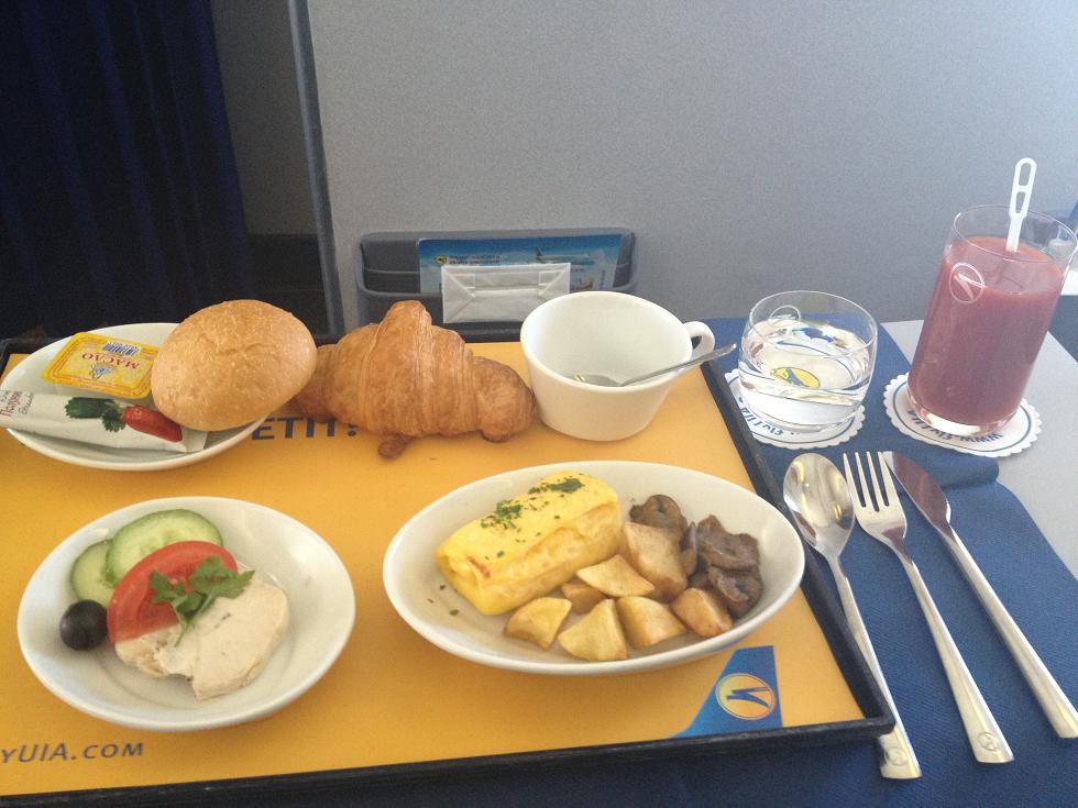 Удобные широки кресла с большим углом откидывания спинки, подушки и пледы, свежий салон, очень приветливые бортпроводники, обслуживающие только пассажиров бизнес-класса. Напитки любые в неограниченном количестве, два блюда на выбор, добавка без проблем. Судите сами: Поскольку очень долго шла посадка из-за пресловутого неудачного гейта, руление начали с опозданием в 25 минут. Очень плавно взлетели, легли на курс, набрали эшелон. Все просто замечательно, контраст по сравнению с наземкой просто разительный.