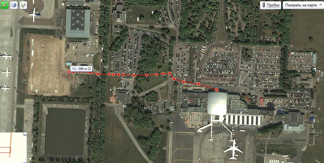 Если я не ошибся в размещении терминала, то примерно метров 400