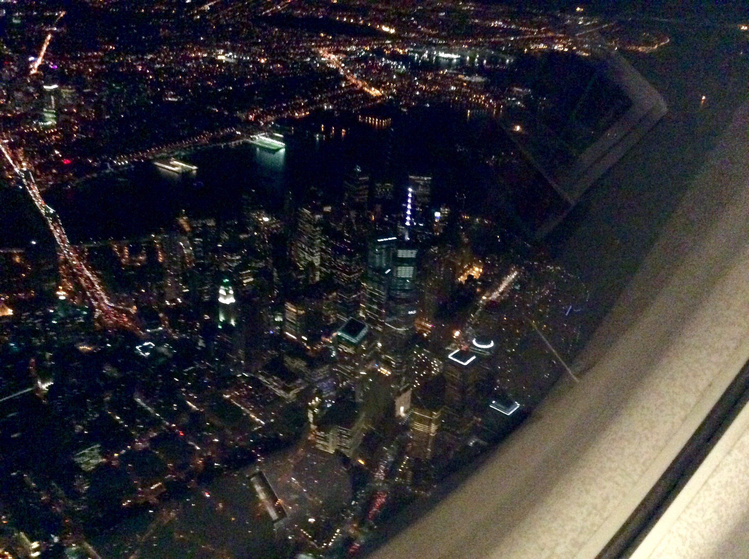 Мадам в Ванкувере сделала мне прекрасную услугу, посадив меня на этом рейсе у окна слева в зоне preferred seating (сразу за бизнес-классом). Пространство для ног там было заметно больше. Кроме того, она сделала то, о чём я только мечтал. При подлёте к Нью Йорку самолёт стал огибать ночной Манхеттен ПРОТИВ ЧАСОВОЙ СТРЕЛКИ, так что я наслаждался отличным видом из окна. На коротком рейсе платное питание не предлагалось. Стандартные напитки и пачка крекеров.