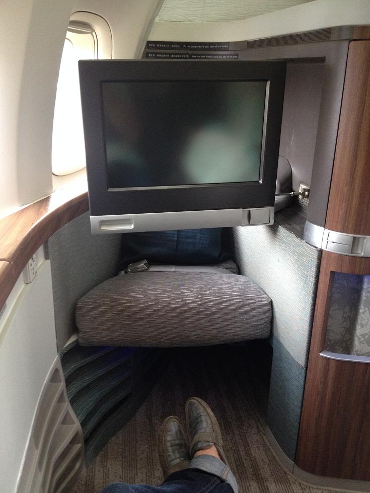 Борт Boeing 747-400, регистрационный номер B-HUE, оказался далеко не хуе, немотря на довольно почтенный возраст. В первом классе 9 так называемых сьютов:
