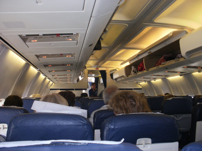 Вылет по расписанию. Грузили автобусом. Самолет Б737-400. Загрузка всего 25-35%. Из минусов, - расстояние между креслами такое, что самолеты Визз Эйр покажутся бизнес классом. Наверное, самый тесный самолет, в котором я когда-либо сидел (разве что, может посоревноваться с А320 Донбассаэро). Бизнес класс организован путем постановки столика на среднее кресло и установкой перегородки. Причем, визуально, расстояние между креслами в бизнесе (кроме первого ряда) не отличалось от расстояния в экономе.