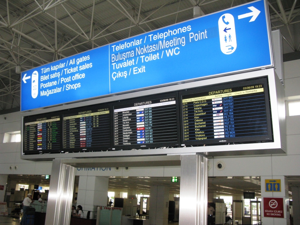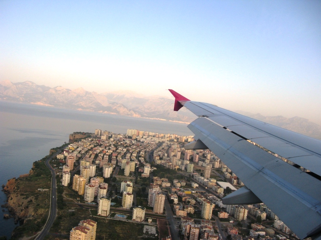 Прилёт Визз осуществляет в Терминал 2. Оттуда добраться, а точнее выбраться можно только на такси - в любой соседний город, ценник есть возле стоянки такси (можно в долларах, евро=разница есть в зависимости от курса, здесь в Украине; что-то типа 30 баксов = 20 евро (в центр Анталии), то есть экономней заплатить в евро - ну и в зависимости от дальности). Если вам хочется добраться ещё дешевле есть служба Havas - типа нашего Атаса - в 2009 стоило около 9 лир, где его искать не знаю, так как воспользовался службой такси. Ещё вариант пройтись пешком до терминала №1 (но это судя по растоянию не близко - около 2-3 км.), там есть городское автобусное сообщение с центром Антальи.