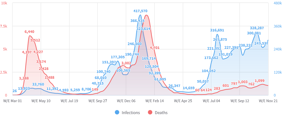 пик волн covid-19 в Украине пришелся на: весна 2020, осень 2020, весна 2021, осень 2021, ...