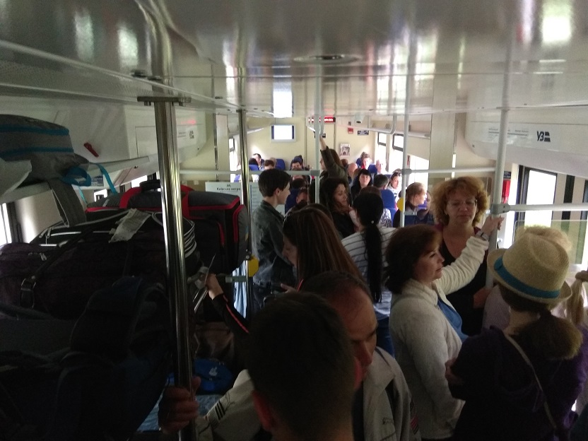 Решил поездом в Борисполь поехать. Компоновка совершенно не подходит для поездок в аэропорт, т.к. с учетом размещения сумок на секции 2+2 пассажира фактически помещается 2, на секции 3+3 помещается 4 пассажира. Сидеть друг напротив друга нереально.