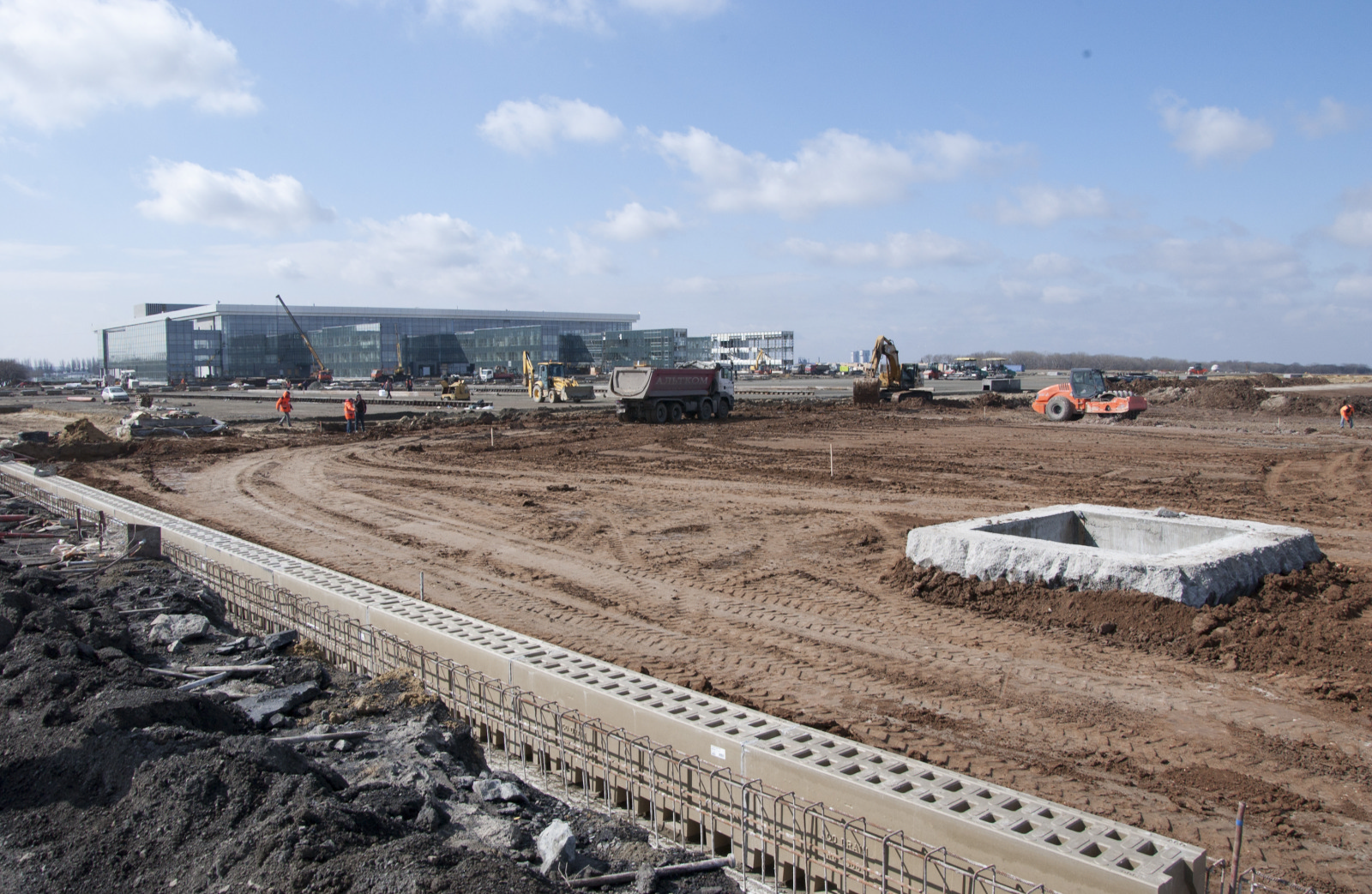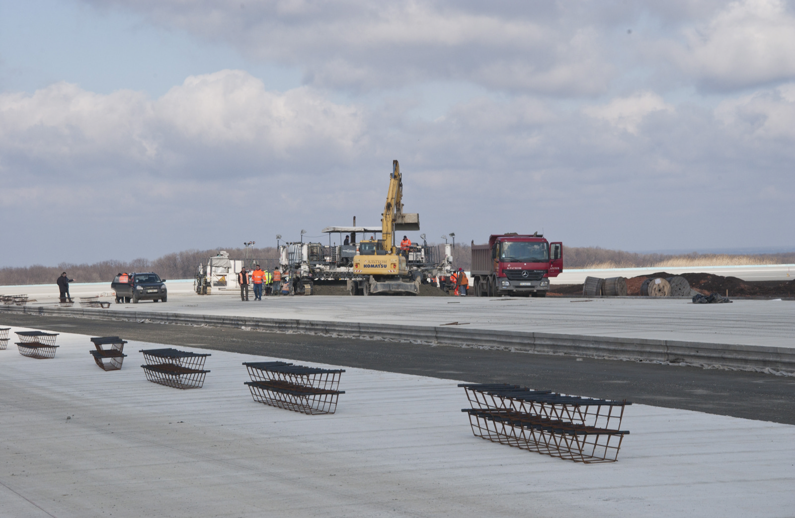 Он также отметил, что строительство обеспечивают мобильные заводы по производству бетона общей мощностью 690 метров кубических бетона в час, работают три бетоноукладчика «Wirtgen»: «SP-1600», «SP-1500» и «SP- 850». Два агрегата укладывают полосу бетона шириной 15 метров и один – 7,5 метра. На сегодня полностью готовы взлетно-посадочная полоса, перрон №2 и пять рулежных дорожек, уложено 1,2 миллиона тонн бетона, создано 550 тысяч метров квадратных покрытия. На объекте работает 400 человек, задействовано 270 единиц техники. Работы ведутся круглосуточно, в три смены.